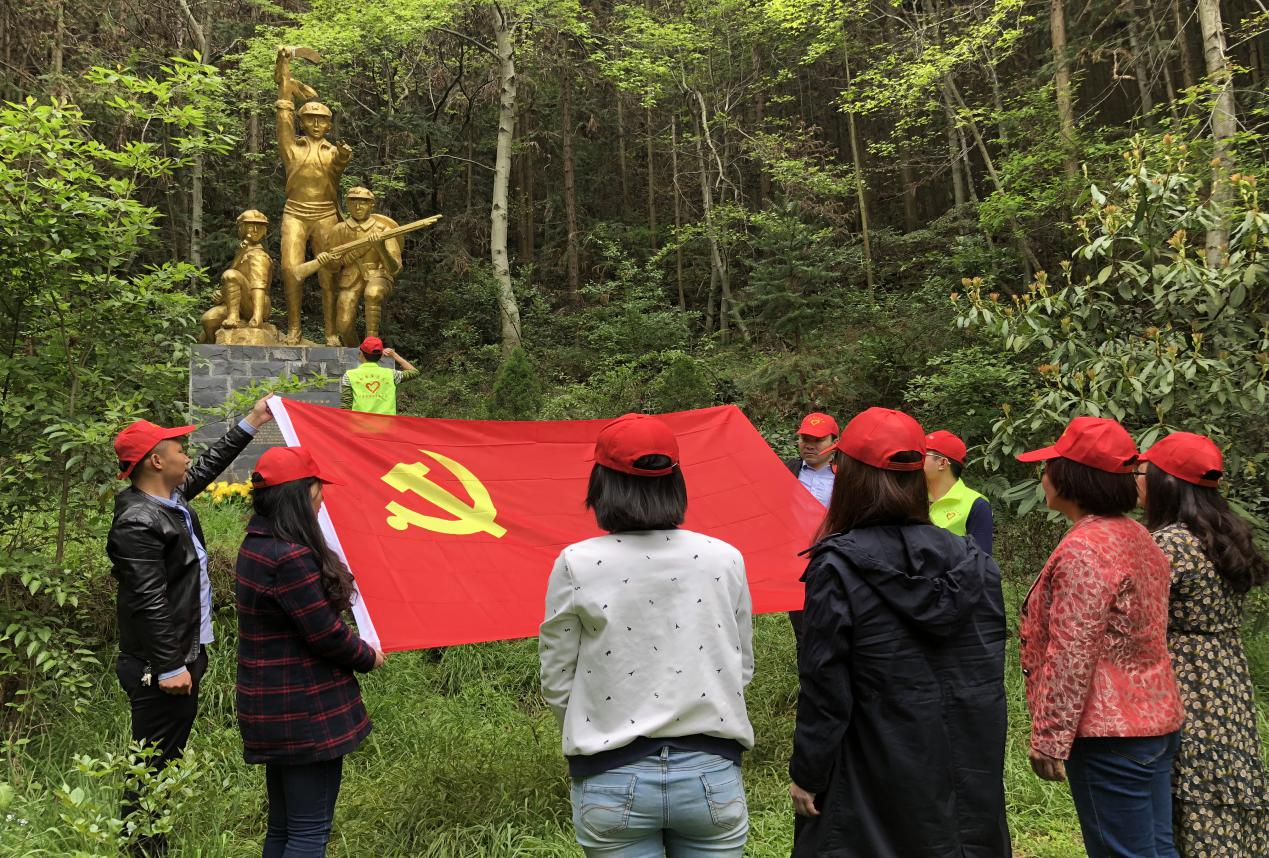 活动中,志愿者及团员代表们一行带着文明祭祀宣传单页分发给景区的游客,行走一个多小时,来到大山深处的红二十七军纪念碑前,为烈士清除碑前的杂草和垃圾并送上鲜花。随后,在纪念碑前,全体肃立,默哀一分钟,深情缅怀革命先烈,仰望他们用鲜血筑起的精神丰碑。鲜艳的党旗迎风飘扬,正是烈士们的奉献和牺牲,才有如今祖国的稳步发展和欣欣向荣。