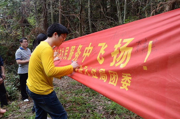 站在白崖寨红二十七军庄严的纪念碑前,队员们通过敬献花篮、默哀、鞠躬等形式向烈士们致以崇高的敬意,以抚慰英雄忠魂,弘扬革命传统,坚定理想信念。面向团旗,队员们还开展了为民服务承诺签名活动,表示要深入学习烈士们不畏风险和人民利益高于一切的精神,立足本职,“让青春在为服务中飞扬”,为构建六型人社、创建部优窗口,实现人社事业跨越而不懈努力。