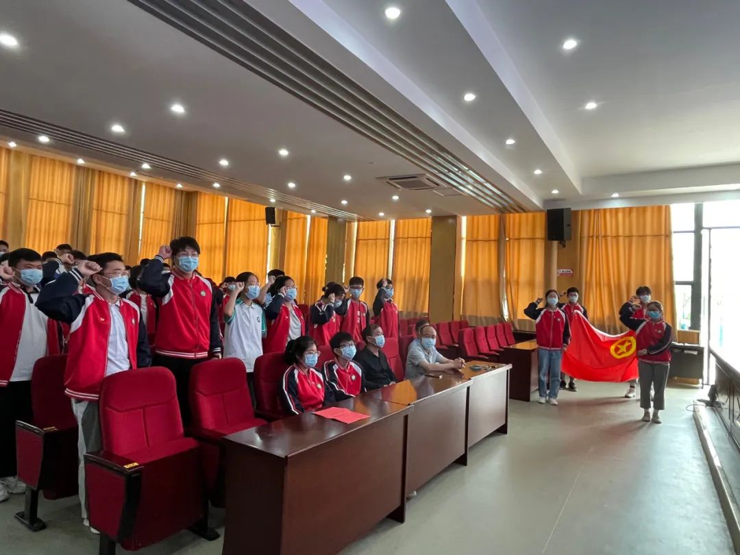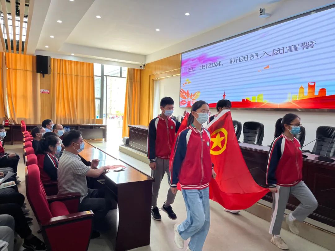新团员入团宣誓仪式在嘹亮的国歌声中拉开序幕。罗金东宣读32名新团员名单,校领导为新团员颁发团员证和团徽,新老团员互相佩戴团徽。团总支副书记孙根带领新团员,举起右手庄严宣誓:“我志愿加入中国共产主义青年团,坚决拥护中国共产党的领导,遵守团的章程……为共产主义事业而奋斗。” 青春的誓言高昂雄浑,表达了大家对共青团组织的无限向往和为团组织增光添彩的豪迈激情。