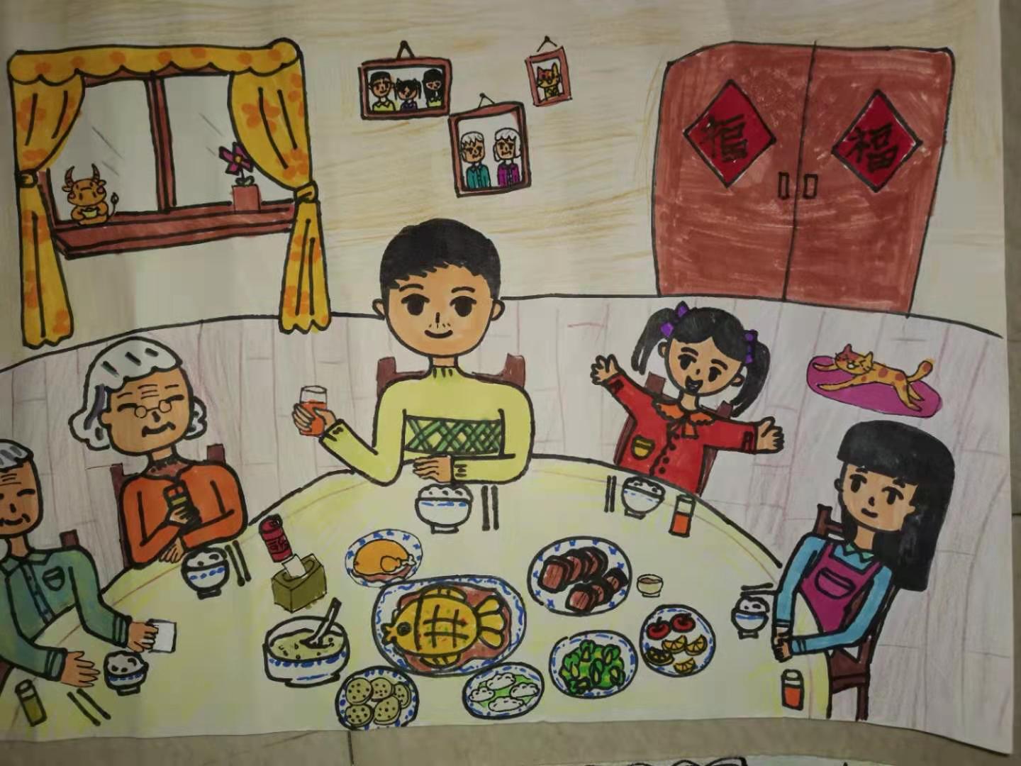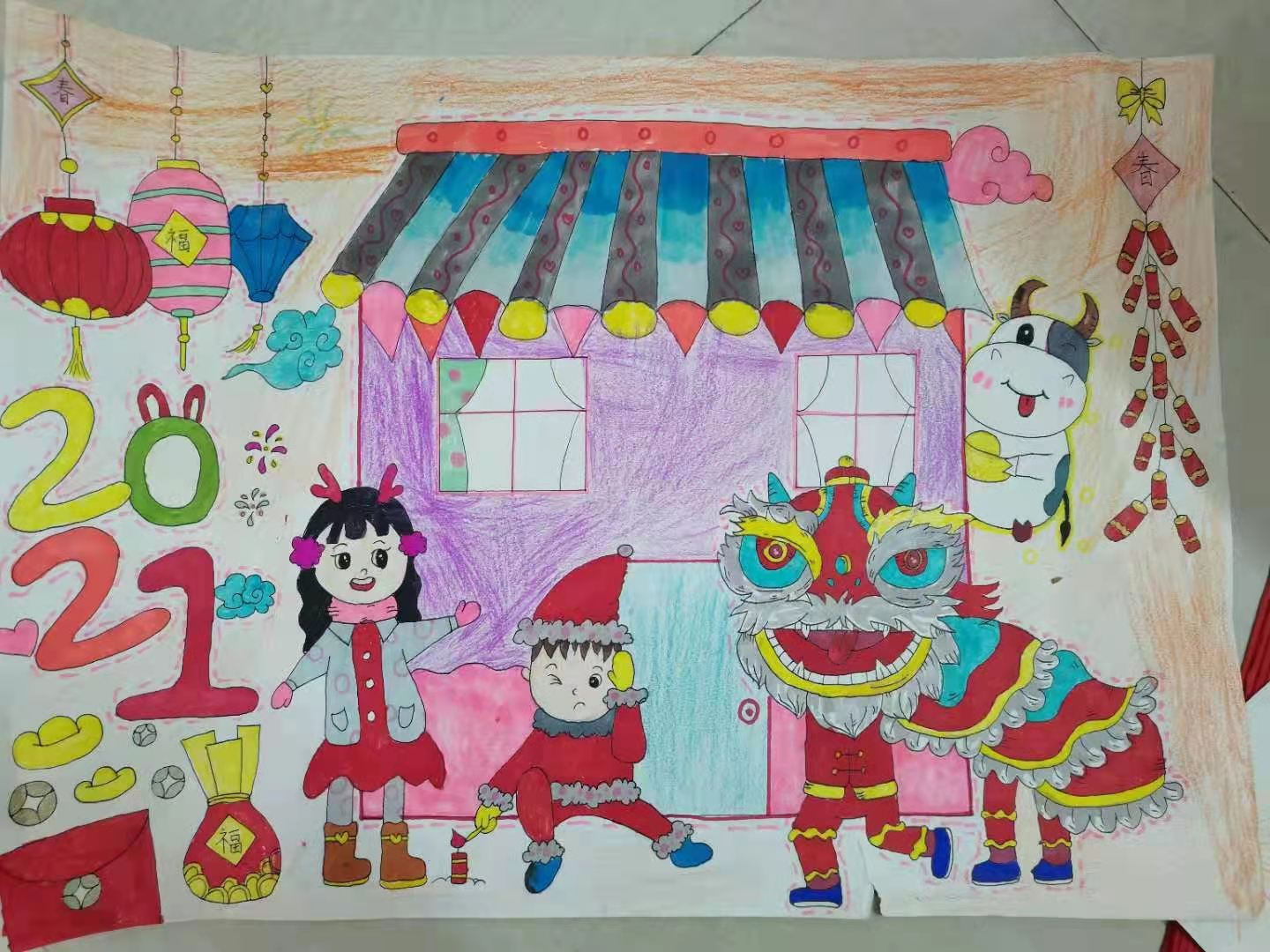 绘画小组也不甘示弱,栩栩如生的“牛娃娃”跃然纸上,他们通过画年画、贴年画、制作手抄报等形式艺术性地表达了对新春的美好祝福。大家纷纷为自己的作品赋予美好的意义,期待新的一年“红红火火”、“牛气冲天”。