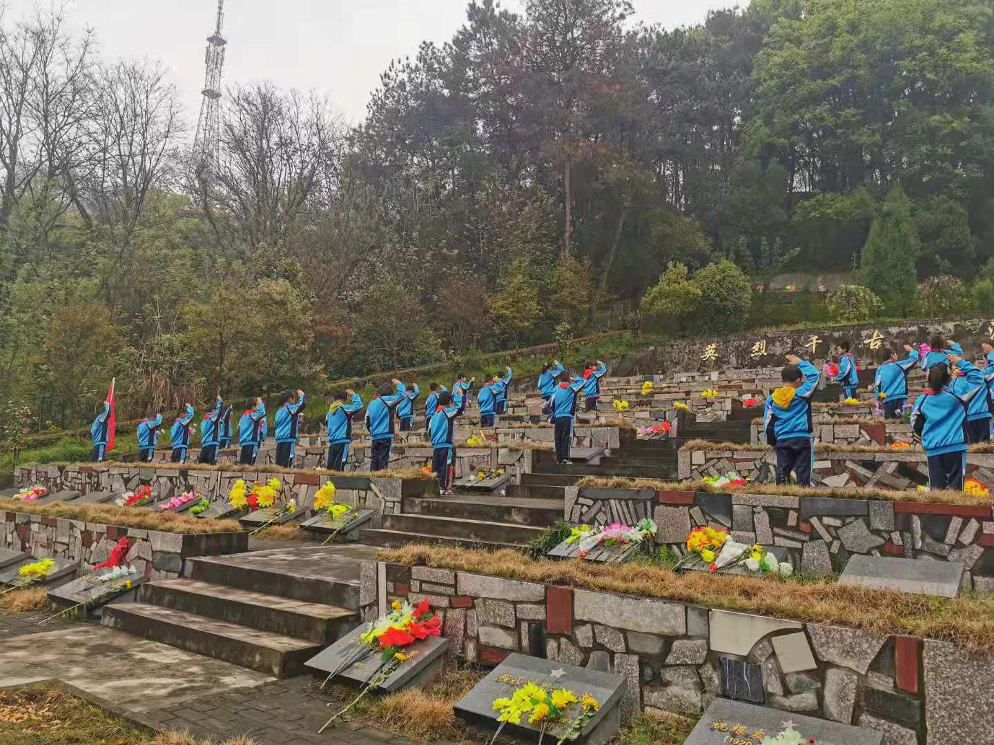 少先队员们穿着整齐的校服,排着整齐的队列,怀着沉重的心情,肃然挺立在烈士墓前。祭扫活动在庄严的国歌声中开始,两名中队辅导员代表向革命烈士们敬献花篮,全体师生代表向革命先烈默哀表示敬意。
