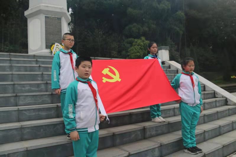 在苍松翠柏环绕的烈士陵园,松兹小学师生们在纪念碑前整齐肃立,敬献花圈,为死难烈士默哀,表达他们对烈士的怀念之情,告慰烈士的在天之灵。在巍峨的“革命烈士永垂不朽”纪念碑下,少先队员面向鲜艳的中国共产党党旗,庄严敬礼,许下“从小学党史,永远跟党走”的庄严承诺。