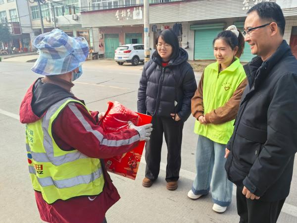 活动中,党委副书记及乡团委青年志愿者来到乡域主次干道、集镇广场等保洁点位,与环卫工人亲切交流,详细了解日常作业、作息保障与生活情况,对大家顶严寒、守岗位、用汗水守护乡村洁净的辛勤付出表示衷心感谢与崇高敬意。志愿者为环卫工人们送上新春礼包及春联福字,叮嘱大家注意防寒保暖、劳逸结合,平安过节。