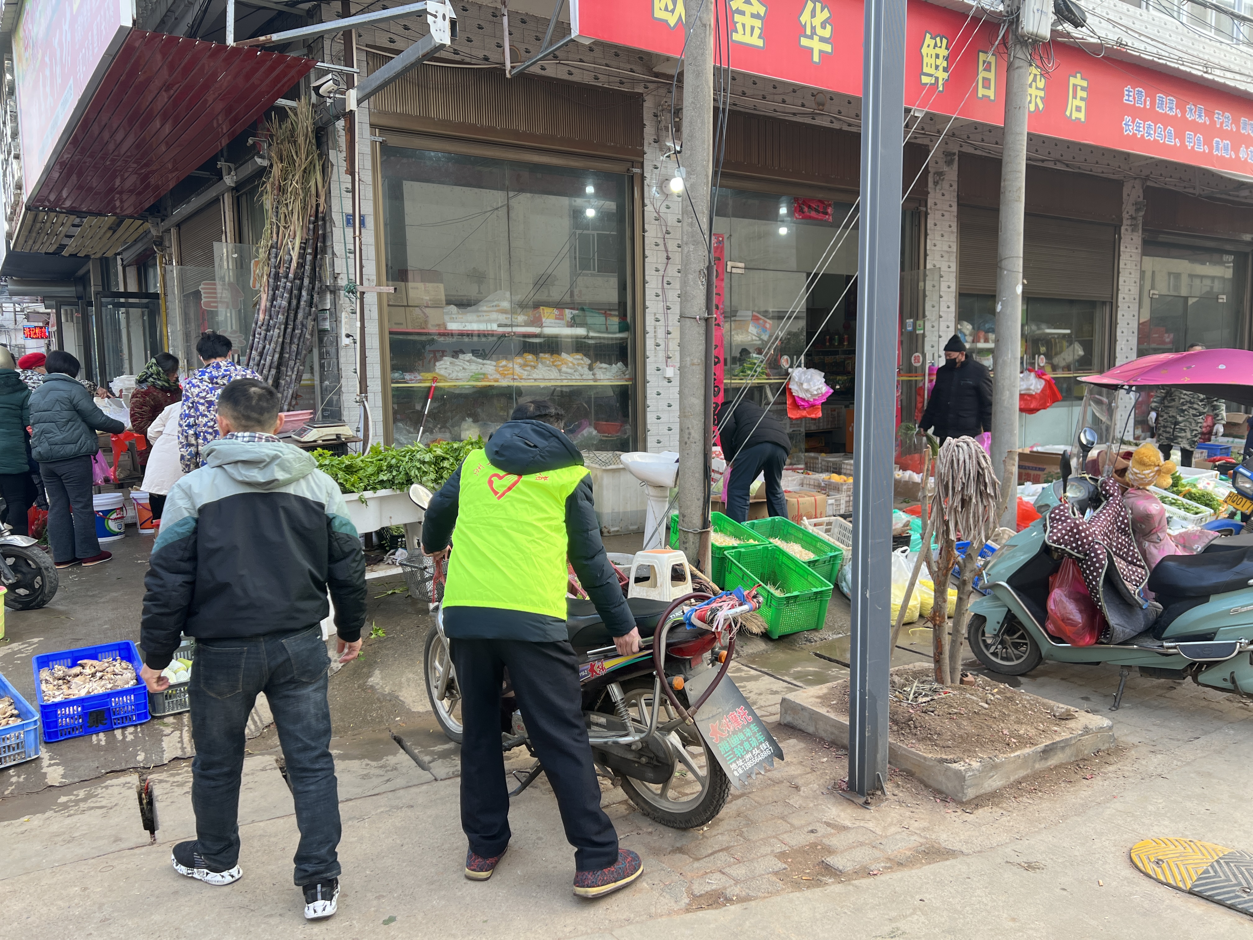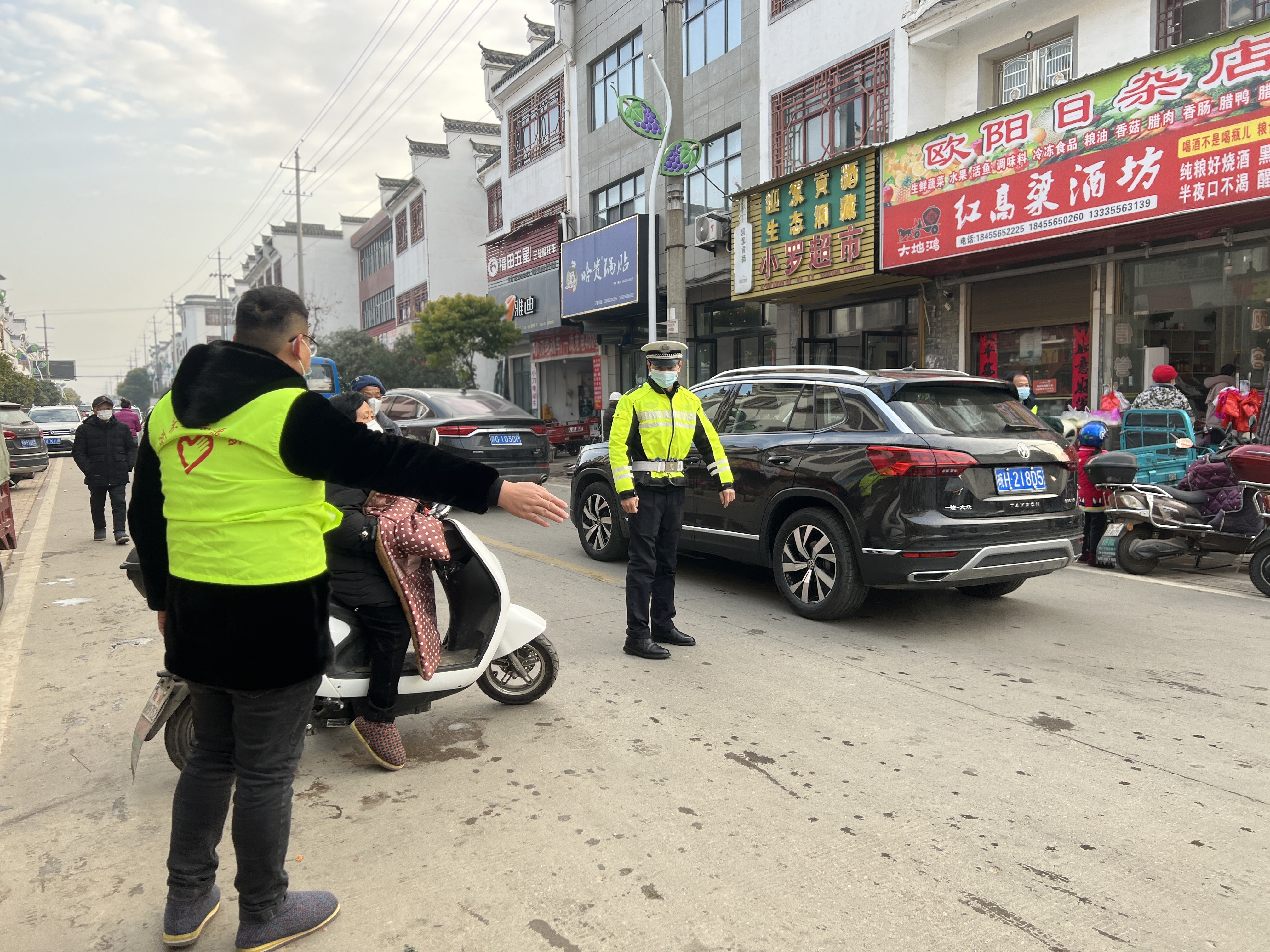 在卫生院路口,购买年货的群众与道路上来往的车辆汇聚在一起,给交通秩序带来很大压力。志愿者们身穿绿马甲积极协助交警,通过定点劝导、流动巡逻、发放宣传单等形式,对过往车辆、行人开展交通安全知识宣传,引导小轿车、电瓶车、三轮车等车辆有序停放,疏导车辆按照规定的车道行驶,并对非法占道、乱停乱放等现象进行了教育引导。