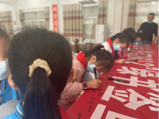活动现场,青年志愿者首先组织学生们有序开展“绿书签”签名仪式,同学们用稚嫩的小手在红色横幅上庄严地写下自己的名字。