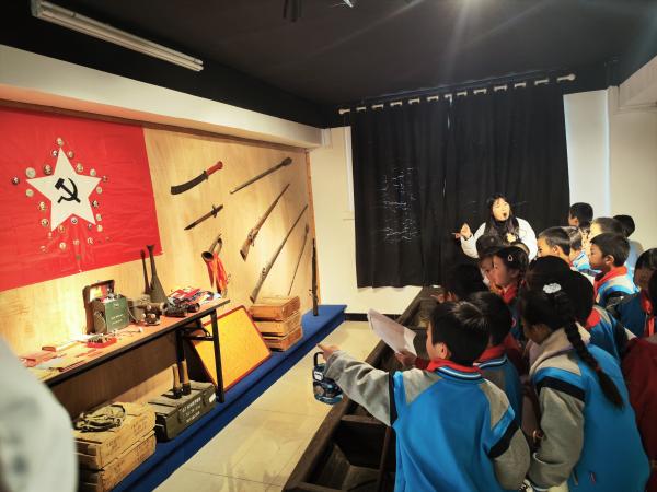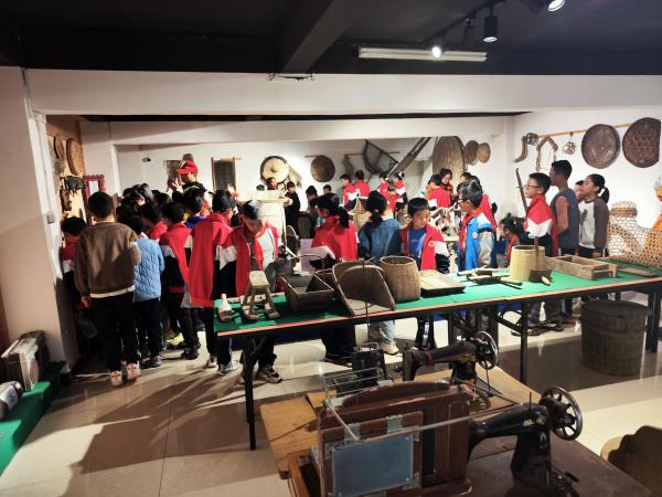 抵达高岭乡文化广场后,队员们分批次进入展厅参观。展厅内,犁、耙、水车、纺车等传统农耕工具整齐陈列,高岭乡综合文化站的解说员首先生动讲解了各类农具的名称、用途及背后的农耕历史,带领队员们走进先辈们的生产生活场景。队员们听得认真、看得仔细,一边触摸农具部件,一边在任务单上记录发现,不时与同伴、老师交流探讨。